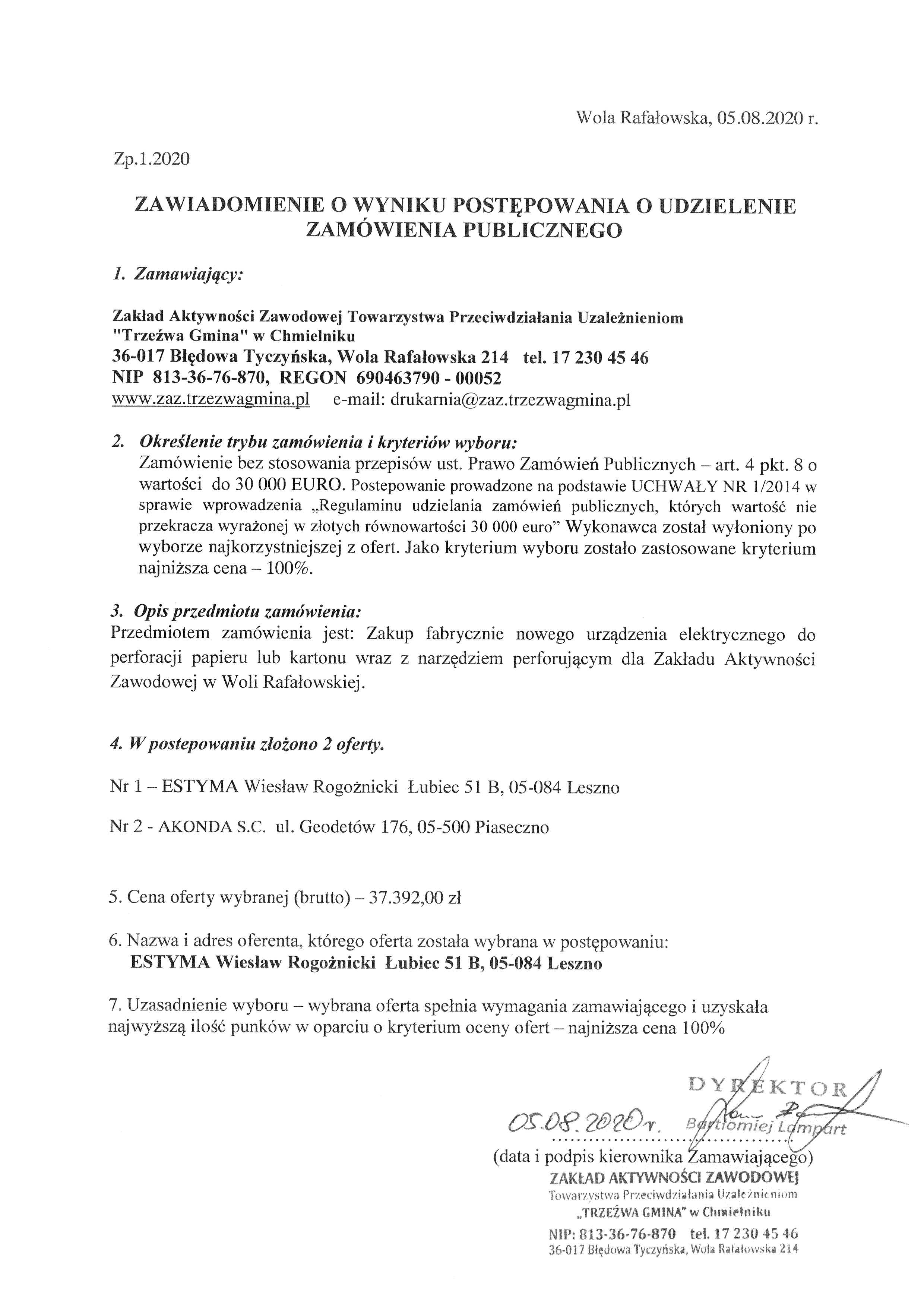 Zaproszenie do złożenia oferty „Zakup fabrycznie nowego urządzenia elektrycznego do perforacji papieru lub kartonu wraz z narzędziem perforującym dla ZAZ TPU Trzeźwa Gmina w Chmielniku”